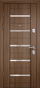 Древесные тона. Входная дверь темный дуб и входная дверь темный орех — универсальная классика под бежевые стены и тёплые полы. Дверь входная темный венге даёт максимальный контраст в светлом интерьере и хорошо поддерживается чернёной фурнитурой.